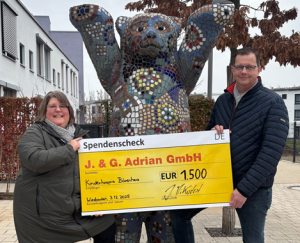 J. & G. Adrian unterstützt diese Arbeit seit Jahren. Auch in diesem Jahr überreichte Betriebsleiter Jens Mikoteit einen symbolischen Spendenscheck in Höhe von 1.500 Euro an Silke Moyer vom Fundraising-Team von Bärenherz.